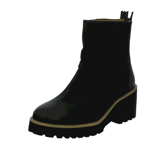 Hochwertige Stiefelette auf markantem Keilboden in sehr leichter Ausführung von Paul Green, Obermaterial Nubukleder in schwarz, Reißverschluss an der Ferse, schöne braune Rahmenbetonung
