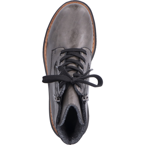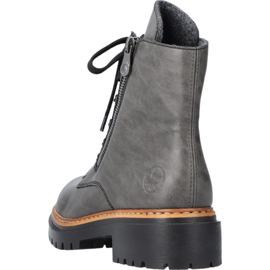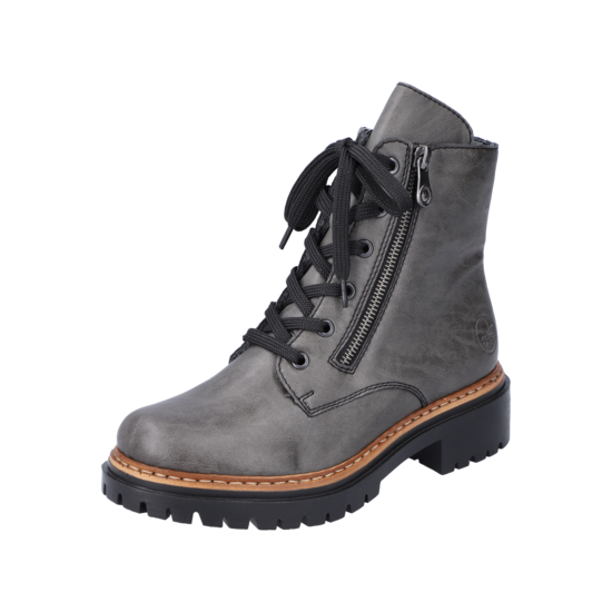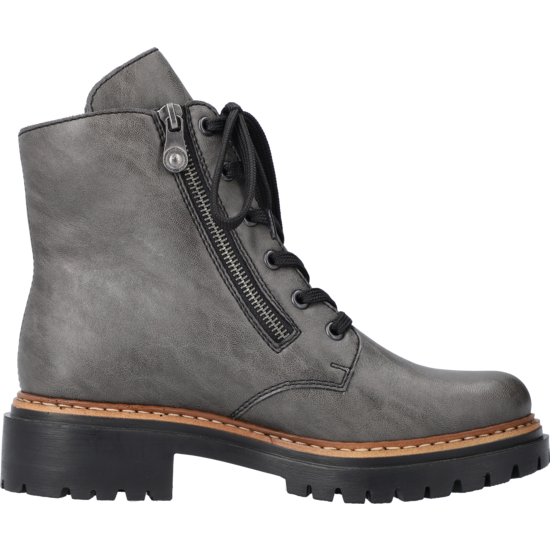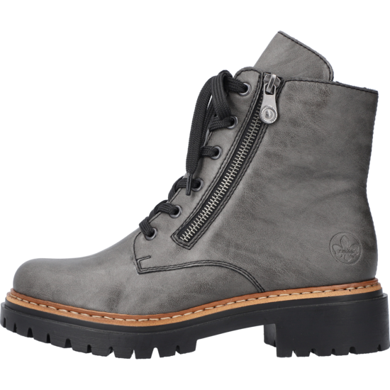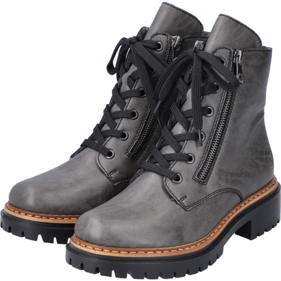 Trend-Boots zum Verlieben! Rebellisch cool und total angesagt sind diese anthraziten Biker Boots mit hohem Schaft von Rieker. Die clevere Kombination aus Reißverschluss und Schnürung ermöglicht ein einfaches An- und Ausziehen. Eine braune Naht am Sohlenübergang rundet das moderne Design perfekt ab. Die leichte und schockabsorbierende Profilsohle mit kleinem Absatz bietet anhaltendes Wohlgefühl – auch an langen Tagen. Ein weiteres Plus ist die weiche Decksohle. Diese Schuhe sind die perfekte Symbiose aus Stil und Komfort.